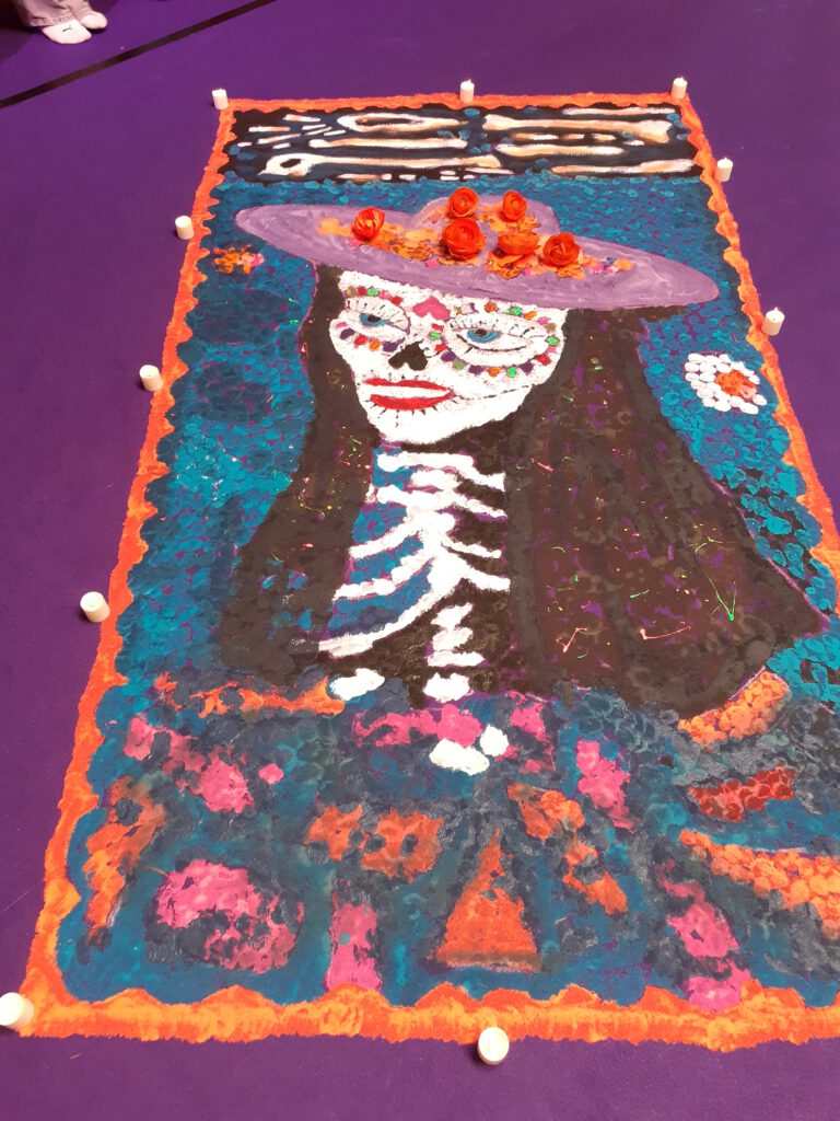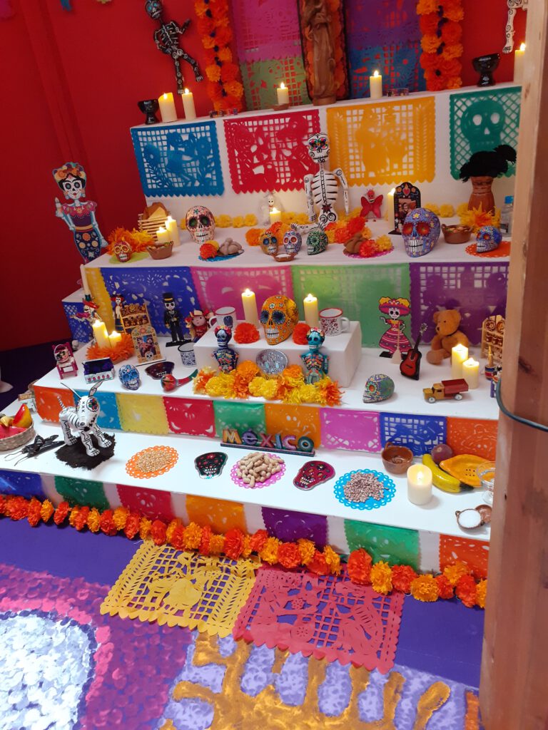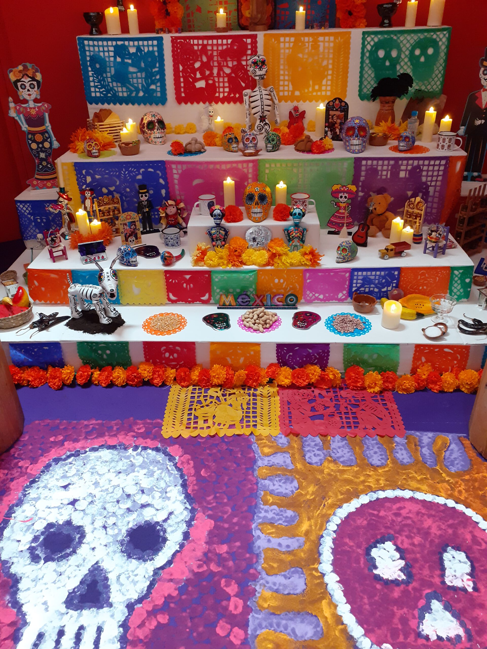 Die MiMa zeigt viele Facetten zum Thema „Tod: Zeit & Unsterblichkeit“; verschiedene Kulturen – von den alten Ägyptern bis zum „Dia de Muertos“ in Mexiko, kreativer Umgang mit Trauer und Erinnerungskultur sind nur einige Beispiele dieser großartigen Ausstellung. Und über allem steht der Aspekt des Mitmachens. Gerade das hat die Schülerinnen und Schüler der 9. Klasse sehr angesprochen. „Man war dem Tod, aber auch den toten Menschen und Tieren, welche man verloren hat, sehr nah und spürte eine große Verbundenheit“, sagt Sophie aus der 9d. Respekt und ein leichtes Schaudern empfanden sie im Raum mit dem Sarg und den vielen Todesanzeigen. Tim aus der 9e fand die Anzahl der damit verbundenen Toten erschreckend. Das „Probeliegen“ in einem Sarg ist natürlich freiwillig und nicht wenige haben es ausprobiert. So können Berührungsängste abgebaut werden.