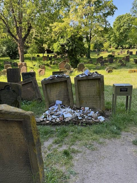 „In Worms haben wir viel über den jüdischen Friedhof gelernt. Wir haben gelernt, dass die Juden, anders als wir Christen, den Verstorbenen keine Blumen oder Dinge wie Kerzen ans Grab legen, denn den Juden ist die Totenruhe sehr wichtig. Stattdessen legen sie kleine Zettel mit Steinchen ans Grab. Auf den Zetteln stehen gute Wünsche für die Verstorbenen und Bitten. Mit den Steinen werden die Zettel beschwert, damit sie nicht wegwehen. Alle Jungen mussten eine Kopfbedeckung tragen. Die meisten jüdischen Männer tragen eine Kippa. Wir waren dann in einer Synagoge und haben dort den Toraschrein gesehen. Auch in der Synagoge mussten alle Jungen eine Kopfbedeckung tragen. Der Judenfriedhof in Worms war einer der größten der Welt und der älteste erhaltene in Europa. Er war wirklich riesig.“