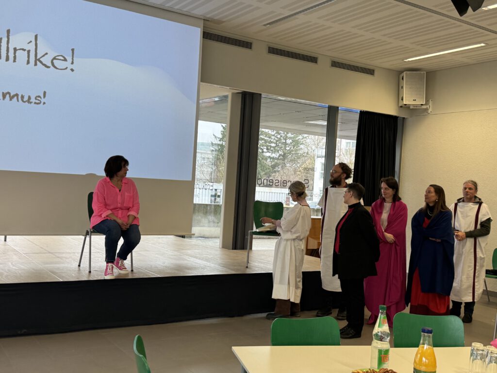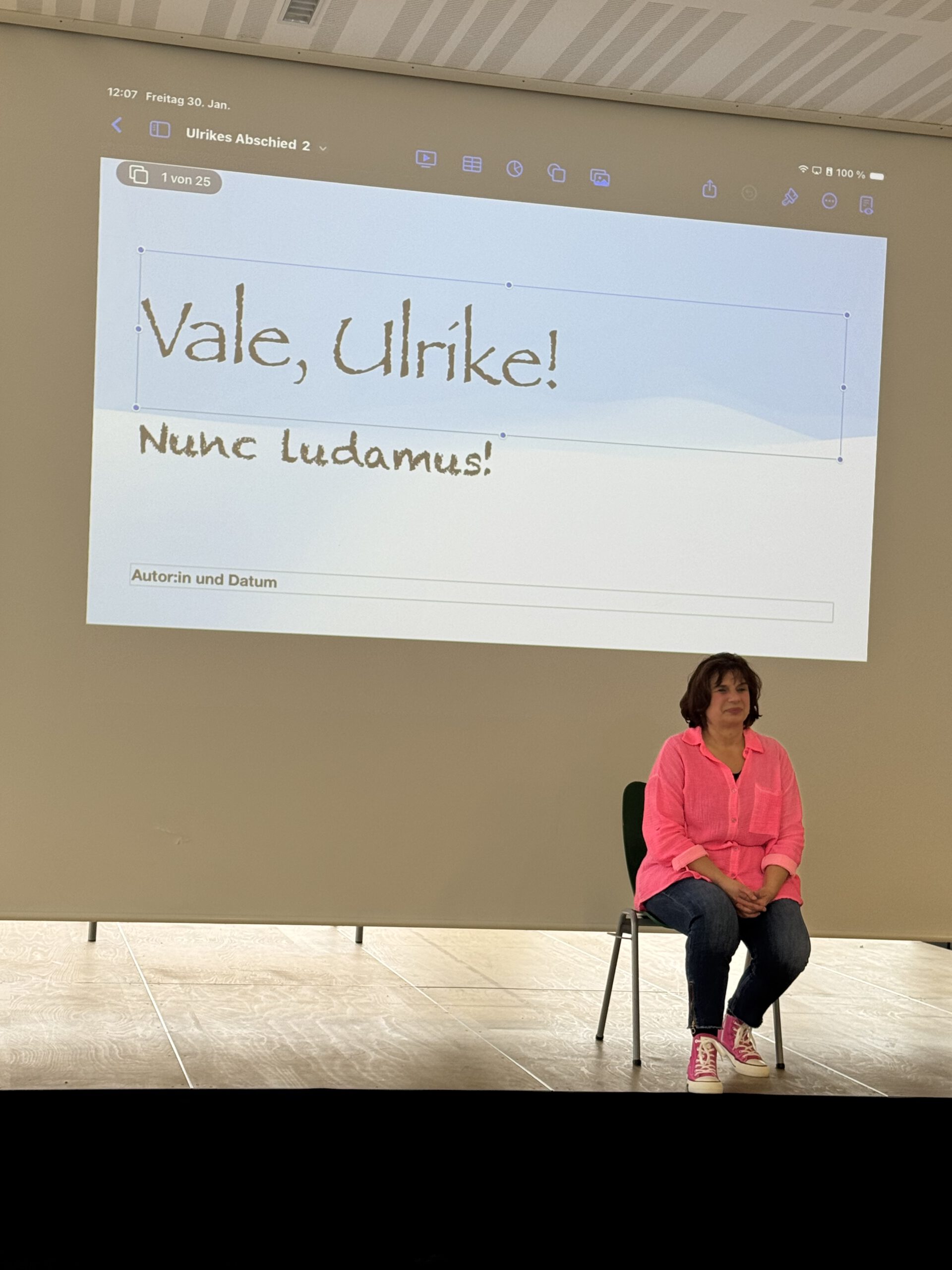 Ulrike entwickelte das Fach Latein am SMG maßgeblich und kontinuierlich weiter. Die „Römische Woche“ in der Projektwoche ist nur ein Beispiel für ihre Hingabe an ihr Fach. Das Abschiedsgeschenk der Fachschaft Latein musste Ulrike sich erst redlich „verdienen“, indem sie in einem unterhaltsamen Activity-Quiz lateinische Sprichwörter wie „Tempus fugit“ oder „Errare humanum est“ erriet.