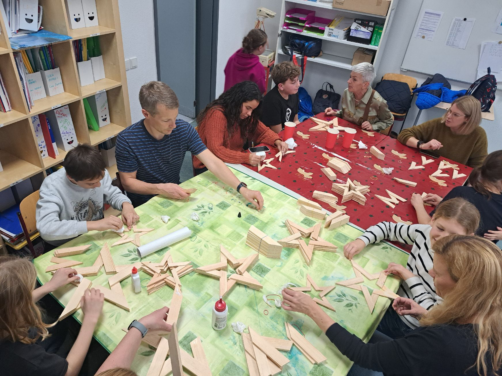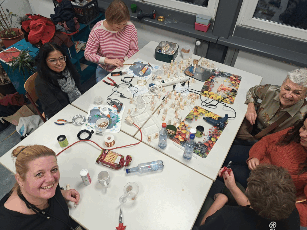 Die langen Tische waren bedeckt mit Holzstücken, Klebstoff, bunten Papieren und allerlei funkelnden Kleinigkeiten. Schon beim Betreten des Klassenraums lag ein wohliger Duft in der Luft – eine Mischung aus frischem Holz, Leim und Plätzchen. Während im Hintergrund leise Weihnachtsmusik spielte, arbeiteten Kinder, Eltern und Lehrkräfte gemeinsam an kleinen Kunstwerken. Es war rührend zu sehen, wie alle zusammen kleine Schätze erschufen – konzentriert, fröhlich, manchmal kichernd, manchmal stolz ihre Werke präsentierend.