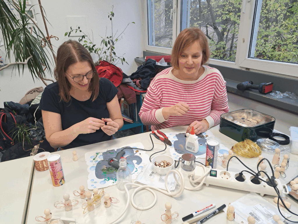 Mit viel Geduld, Kreativität und einem Hauch von Vorweihnachtsmagie entstanden filigrane Holzsterne, süße Engelchen und festliche Grußkärtchen, die am Adventsbasar (28.11.2025) zum Verkauf angeboten werden sollen.