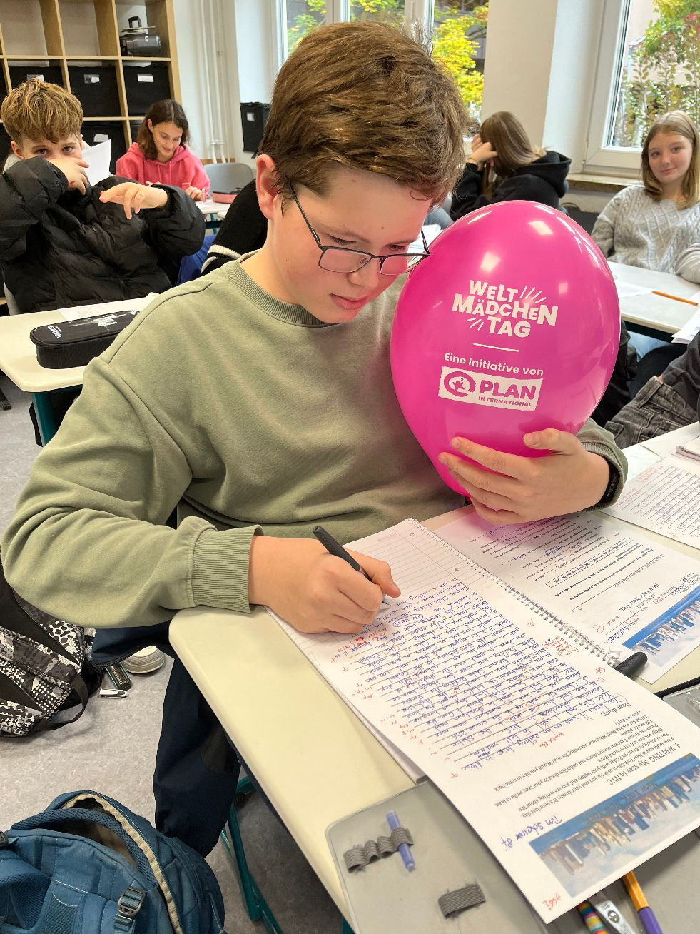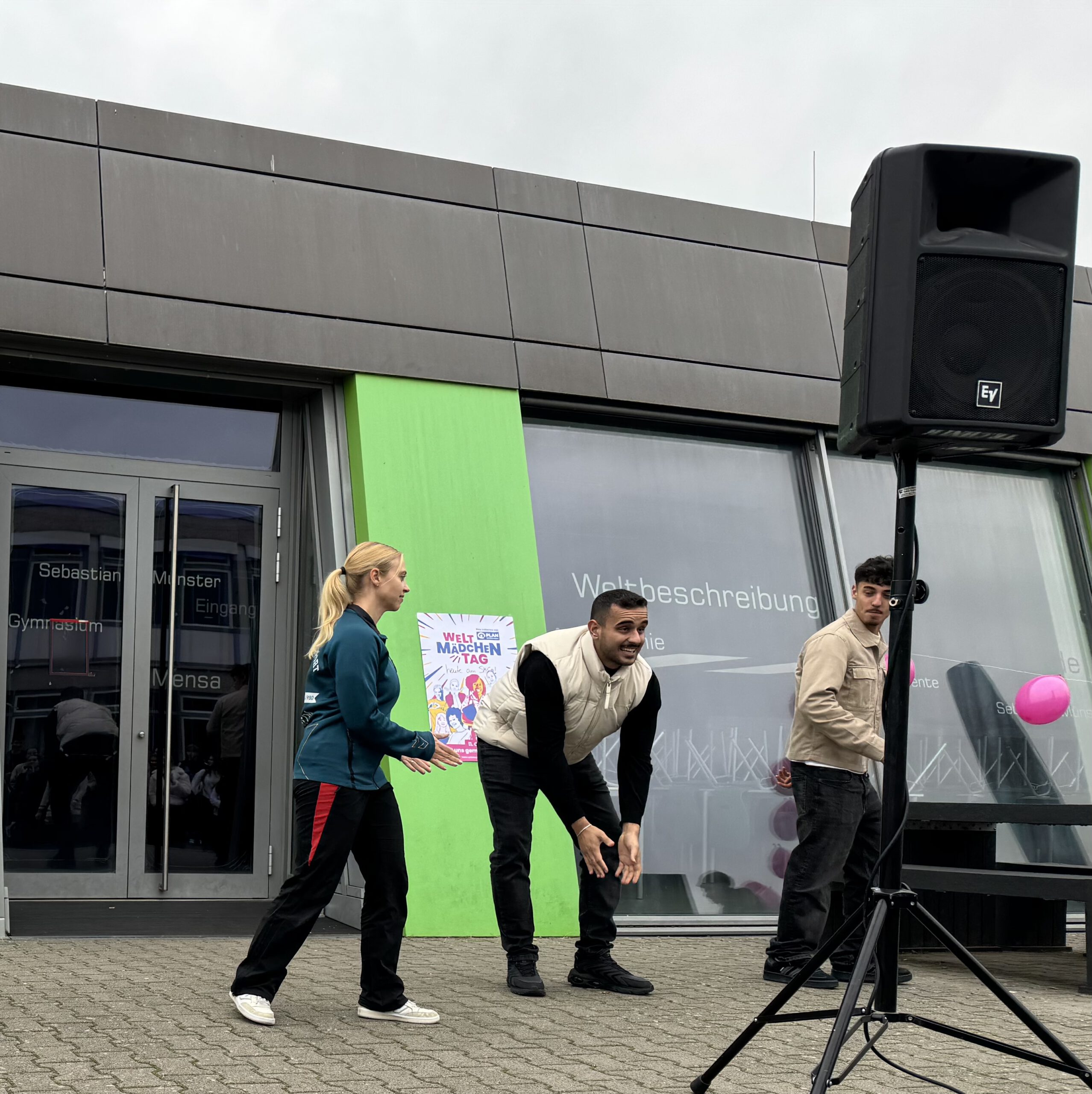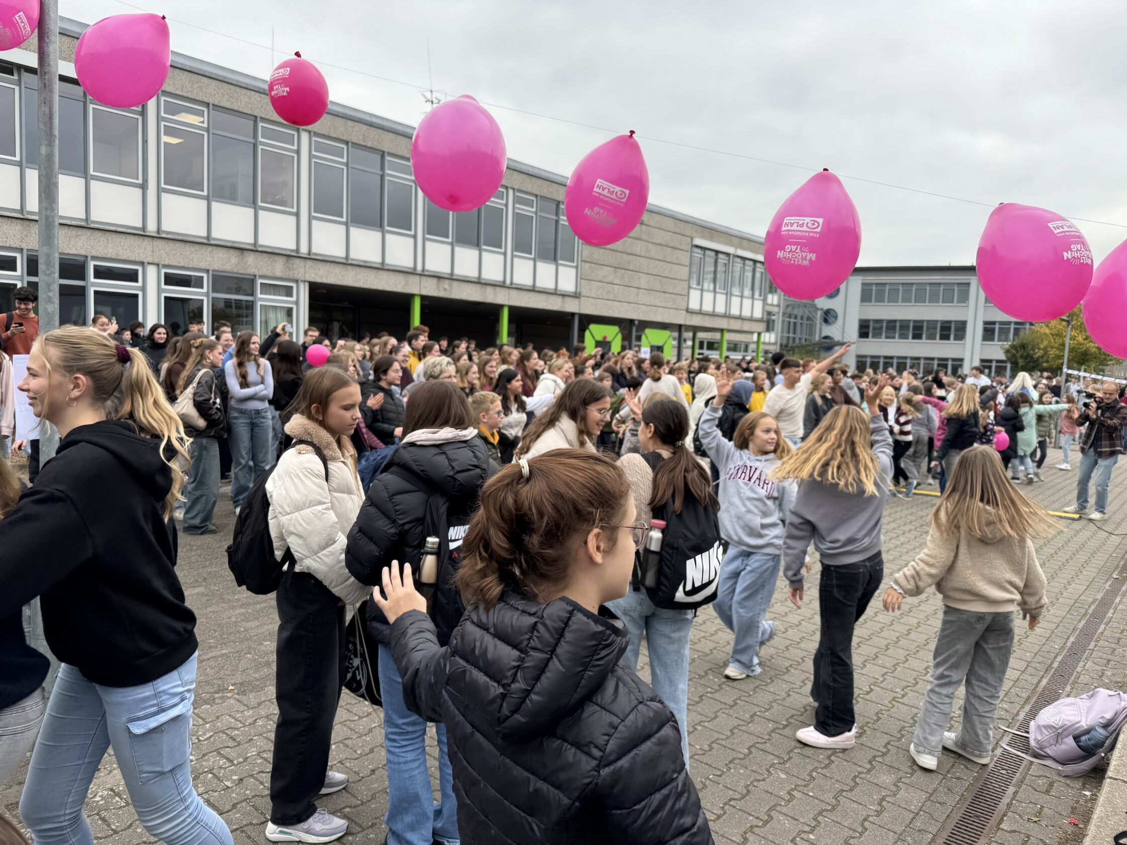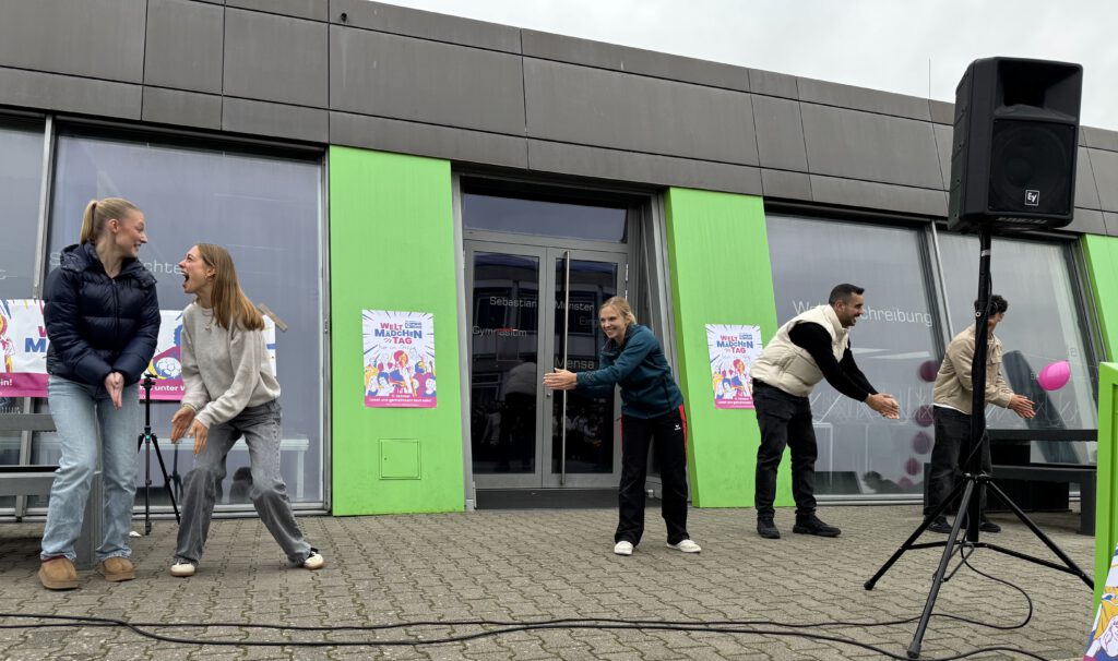 In diesem Jahr stand und steht die Verhinderung von Kinderheirat im Fokus: Auf diesen Missstand hinzuweisen und überhaupt ein Bewusstsein für die Belange und Rechte von Mädchen und Frauen allgemein zu schaffen, sollte unsere Tanzaktion dienen. Zusätzlich wollten wir mit unserer Aktion Politiker und Politikerinnen dazu auffordern, gesetzliche Voraussetzungen dafür zu schaffen, Mädchen vor der Frühverheiratung zu schützen und dafür zu sorgen, dass sie in der Lage sind, überall auf der Welt ihre Rechte wahrzunehmen. Unser Ziel: Mädchen und Jungen sollen weltweit die gleichen Rechte und Chancen haben, ihre Zukunft zu gestalten. Es war überwältigend zu sehen, mit welchem Spaß und welcher Begeisterung die Anwesenden unter der choreografischen Leitung von Lydia Engel mit ihrem Leistungskurs Sport bei der Sache waren. Auch beteiligten sich die AG Ehrenamt, die AG Nachhaltigkeit, die AG Schule ohne Rassismus – Schule mit Courage, die Kinderrechtsorganisation PLAN International sowie die SV an der Aktion – nicht zu vergessen Mitglieder des Technik-Teams sowie unsere Schulleitung!